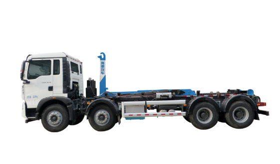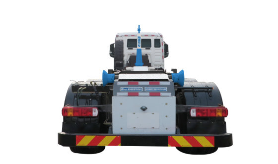 后支撑装置由液压驱动的后支撑装置,在钩起和卸下载物箱体时,放下支撑轮架,起到辅助支撑的作用。独特的一体式加大滚轮使整车的重心范围加大,从而保证了整车的稳定性与可靠性。